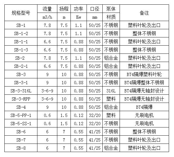 根據(jù)所輸送的液體性質,泵體沾濕部分材料可選鋁合金、304不銹鋼、316L不銹鋼、PP塑料、RPP增強聚丙烯、PVDF、PTFE等組成。驅動電 機配備單相標準電機,無刷電機,防爆電機,高轉速電機等多種選擇。電機塑料外殼采用PC聚碳合成塑料(德國黃),根據(jù)輸送介質粘度、比重、腐蝕性 程度不同所配置泵體材質和電機各有不同,產(chǎn)品可分為五大系列30多種型號,該系列泵可按防爆區(qū)域和非防爆區(qū)域選用,如在易燃易爆場合使用,可選用我公司生 產(chǎn)的防爆型電動抽液泵(SB-3型、SB-3—1型、SB-4型、SB-3-RPP型、SB-3-316L型)。使用防爆型電動抽液泵時應按 GB38361-2《爆*環(huán)境用防爆電氣設備》有關規(guī)定并正確使用防爆插頭插座。